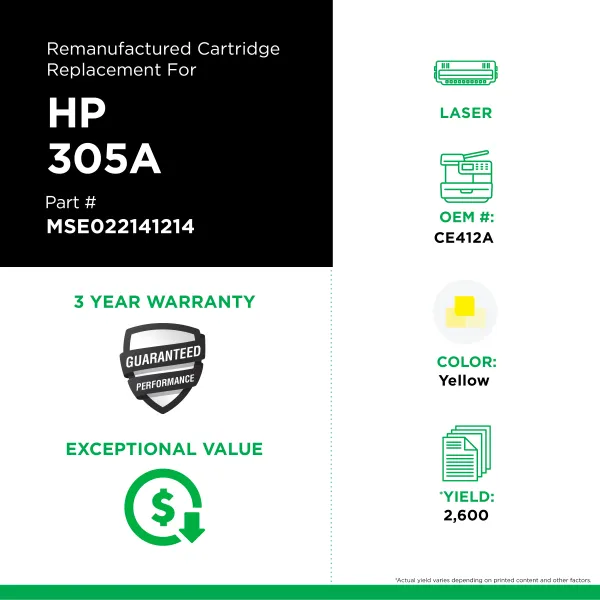 MSE Remanufactured Yellow Toner Cartridge for HP 305A (CE412A)