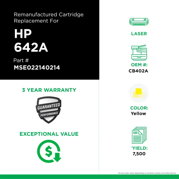 MSE Remanufactured Yellow Toner Cartridge for HP 642A (CB402A)